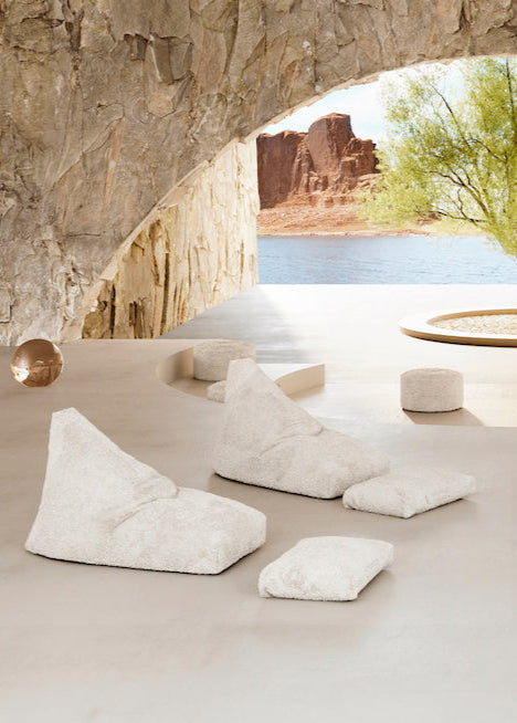 Pouf Chair aus 100 % recycelten Fasern. Der Satellite 68 Noah Hocker ist ein luxuriöser, hochwertiger Indoor-Hocker, hergestellt aus 100 % recyceltem Stoff.